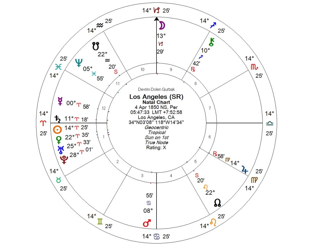 Gökyüzünde ise Ay ile Mars Koç ve Yengeç burcunda karşılıklı ağırlama halindeydi. Los Angeles’ın 4. evinde gerileyen Mars üstteki haritada görülüyor. Ay ise Chiron’la birlikte natal Koç stelyumunun üzerinde…