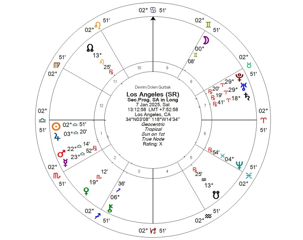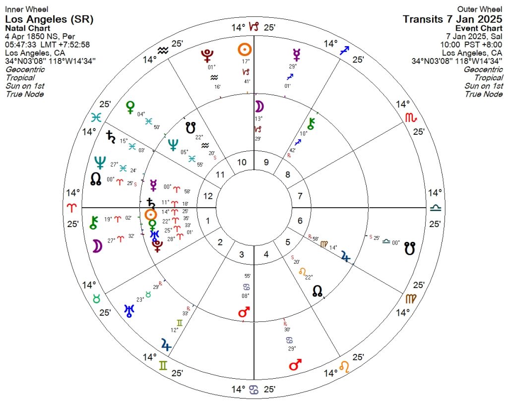 Los Angeles’ın doğal afetlerle ilgili 11. evini Satürn yönetiyor ve yanık durumda. Satürn hem ormanları hem de binaları sembolize ediyor.