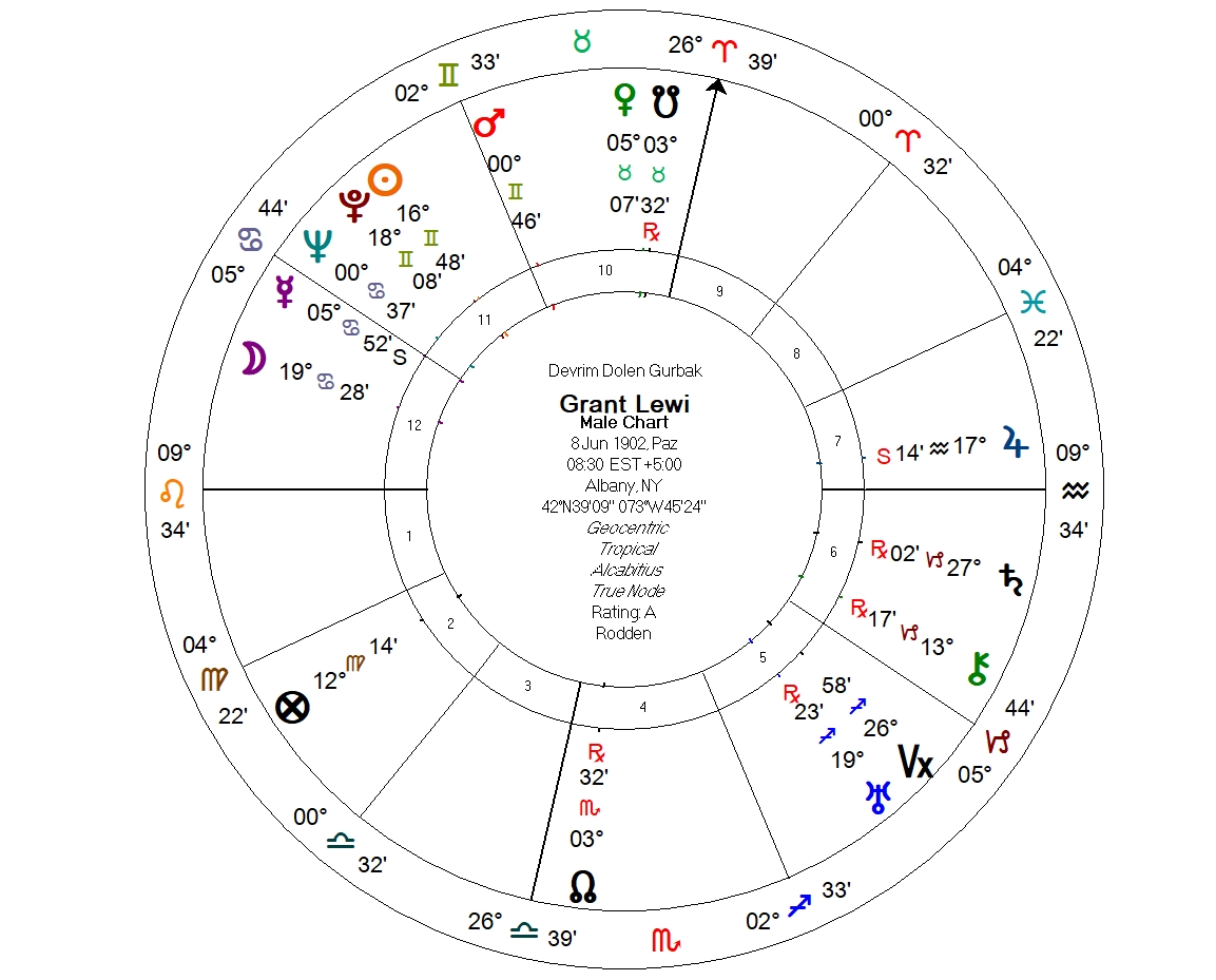 Lewi’nin ölümü de astroloji tarihinin copy-paste ve Satürn algısı yanlışlığı örnekleri arasındadır. Transit Satürn, doğum Güneş’inin tam üzerinden geçerken yaşamını tamamladığı iddiası Charles Jayne’in ölüm sonrası seminer notları, Zoltan Mason’un AFA Bulletin aktarımları, daha sonra Noel Tyl ve Liz Greene gibi astrologların yazılarında tekrarlanmıştır ancak bu doğru değildir. 11. evdeki (meslektaşlar) İkizler (copy-paste) Mars ve Satürn kontra-antiscium. İkisi de 4. eve (Satürn 4. evin yücelim yöneticisi, Mars da kıstırılmış yönetici) ve hataya (6. ev, retro ve İkizler) işaret ediyorlar.