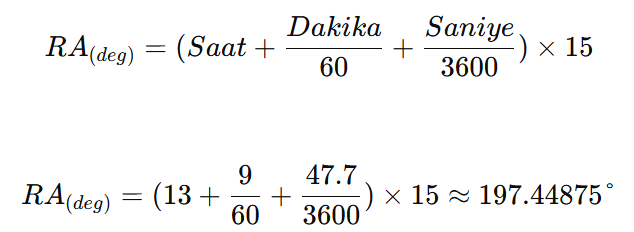1. Gökyüzü tam bir çember olduğu için 1 tam tur 360 derecedir (ve RA sisteminde 24 saat). 1 saat = 15 derece olur çünkü: 360∘ / 24 saat = 15∘ / saat. Sağ açıklık yani RA saat biriminde verildiği için dereceye çevirmek için en son 15 ile çarparız. Ayrıca RA = derece çeviriminde 1s = 15/3600 = 0.0041667° sabiti kullanılır. Bu dönüşümde küçük hata payları büyük nesne konumlarında ±0.01° sapma yaratabilir, ama bu astrolojik karşılıkta ihmal edilebilir.