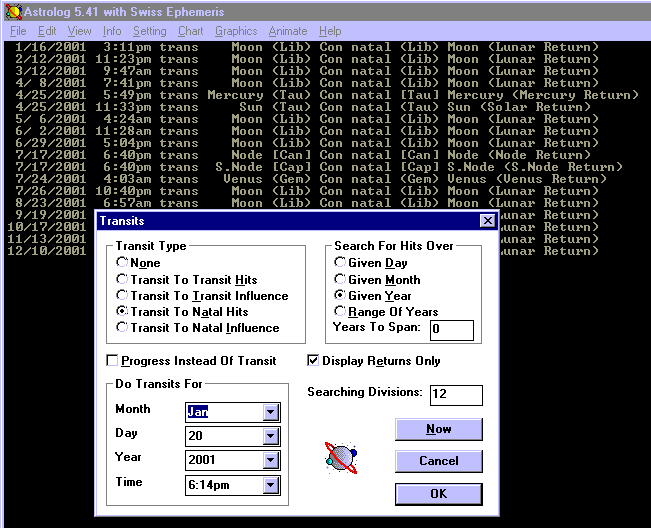 Programımızı indirdik ve açtık. İlk bilgilerimizi girmek istiyoruz. Info/Set chart info’yu tıklıyoruz.Bu menü çıkıyor: Gerekli veriyi giriyoruz. Now Tuşu otomatik olarak içinde bulunduğunuz zamanı girecektir. Tabii PC saat ve tarihiniz doğruysa. Time zone, girdiğimiz koordinatın greenwich farkıdır. Türkiye için –2 girin. Yaz saati için Daylight’i Yes olarak girin.Ok’e bastığımızda haritamız ekrana gelir, fakat programın ‘default’ ayarlarına uygun olarak. Henüz ilgilenmek istemediğiniz minor objeleri elemek elinizde. Şimdi haritamızda neleri istediğimizi belirtmek için Setting/Restriction’a tıklıyoruz:Kutucukları işaretli olanlar ‘kısıtlanıyor’. Yani haritamızda görülmüyor. İleride anlatacağımız usullerle farklı amaçlar için farklı profiller oluşturabileceksiniz. Şimdilik genel isteklerinizi seçin. OK’e basın.Neleri görmek istediğimizi seçtik, şimdi haritamızda kullanılmasını istediğimiz açıları seçelim. Astrolog default’unda büyük açılar, (kavuşum, karşıt,kare,trine ve sextile) var. Mesela 150 dereceyi de görmek için Setting/Aspect Settings’e giriyoruz.Burada da mantık aynı, seçili kutular görünmeyecek. Ayrıca açıların orblarını da değiştirebilirsiniz. Çeşitli uygulamalar için uygun orblar için gurup filesine başvurun. Natal harita için gösterilen bu açılar uygun fakat transit bakarken bu orbları düşürmek isteyebilirsiniz. Aynı şekilde her türlü karşılaştırma işleminde de bu orblar yüksektir. Ayrıca açısız gezegenler için minor aspectleri kullanmak isteyebilirsiniz.Seçeneklere devam. Setting/House System’den tercih ettiğiniz ev sistemini seçin. Setting menüsünde daha ileri seçenekler de mevcut. Ev sistemleri hakkında gruba başvurun 🙂 (Devrim Dölen’in notu: Bahsi edilen gruptaki yoğun deneyler ve tartışmalardan sonra Alcabitius ev sistemi önerilmektedir.)Haritamızla ilgili seçenekleri bitirdik. Şimdi Programın Default kart ayarını yapalım: Info/Default Chart info.Çıkacak menüye gireceğimiz bilgiler, data gireceğimizde otomatik olarak görünecektir. Mesela İstanbul koordinatlarını, tc saat ayarını ‘default’ olarak girebiliriz.(not:correction for now kısmına –600 yazılacak dikkat)Buraya kadar yaptığımız bütün ayarlar, bir defaya mahsustu! Yani programı kapatırsanız, tekrar açtığınızda ‘eski’ default ayarlara dönmüş bulacaksınız. Bunun sebebi, Astrolog programının Astrolog.dat adlı dosyası. Yaptığımız ve kalmasını istediğimiz değişiklikleri bu dat dosyasına kaydetmeliyiz. Bunun için File/Save Settings’i tıklıyoruz. <<<<<Karşımıza yukarıdaki kutu çıkıyor. Astrolog.dat dosyasını seçip tamam diyoruz. Ve ayarlarımız ‘default’ oluyor. İsterseniz farklı adda bir dat dosyası da oluşturabilirsiniz. Örneğin transit.dat’ı görüyorsunuz. Ben bu profilde, 0.5 orb kullanıyorum ve bütün evleri haritamda aktif kullanıyorum.Şimdi ise programa girmiş olduğumuz veriyi kaydediyoruz. File/Save Chart Info. Yukarıdakine benzer bir kutu çıkacak ve bir isim vererek kayıt yapacağız. Yanda Open Chart’a tıkladığımızda ise, önceden kaydetmiş olduğumuz bir dosyayı açabileceğiz. Unutmayın: Program veriyi yani tarih, koordinat ve ismi kaydeder. Resmi kaydetmek ayrı bir şey. Kayıtlar Astrolog programının bulunduğu klasöre konur. İsterseniz burada bir tasnif yapabilirsiniz. Farklı klasörler vs ile.Şimdi ayrıntılara girebiliriz. Yukarıda Graphics menüsünü açık olarak görüyoruz. Reverse Background, örnekte de olduğu gibi siyah zemin yerine beyazı tercih etmenize olanak sağlıyor. Özellikle çıktı alacaksanız bu gerekli. Renklerden de kurtulabilirsiniz. Monochrome’u tıkladığınızda siyah ve beyaz kalacak. Character Scale’dan haritalardaki sembollerin ebatlarını büyütüp küçültebilirsiniz.Haritamızda açıları görüyoruz ama bir metin halinde de görmek istersek, chart/Aspect list’i tıklarız. Örnekte ingilizce açıklamalarıyla açıların sıralanışını görüyoruz. Ben açıklama istemem diyorsanız, view/show interpreter’i tıklayarak kaldıracağız. Yukarıda görülen Chart sayfasında başka seçenekler de var. Mesela Arap noktaları, Takvim, Midpoint listesi vs. Bunlara daldınız ve natal haritanıza dönemediniz? En üstteki Standart list’te bunun için. Tıkladığınızda grafik değil de metin gelirse, view’dan show graphics’i seçeceğiz.Yukarıda bahsettiğimiz View menüsü. Gözlerinizi almasından rahatsız olmazsanız, colored text seçeneği ile metni renklendirebilirsiniz. Renkler rastgele değil. Hava=yeşil, Ateş=kırmızı, Toprak=Sarı, Su=MaviYine Chart filesinden bir opsiyon. Influence. Haritanızda gezegenlerin burç ve evleri açısından birbirlerine etkilemeleri ele alınıyor. Görünen kısımda Ay’ın Merkür’e işaret ettiğini görüyoruz. Çünkü örnek haritada Ay Merkürün yönettiği İkizler burcunda.Natal üzerinde yapabileceklerimi gösterdim. Şimdi Natal’e transit girelim. Info/Transit and Natal’i tıkladığımızda Natal haritanın üzerine Transit yerleşimi ekrana gelir. Görünen kısımda Transit merkürün, Natal MC’ye orblu bir kavuşumunu görüyoruz. Program Transit için anın saatini ve default olarak girdiğiniz koordinat ve ayarları kullanacaktır. Info menüsünde gördüğümüz Set Chart 2 seçeneği ile ikinci bir tarih girebilir ve bu ikinci tarihi, transit, compare, composit gibi ikili harita tekniklerinde kullanabilirsiniz. İkinci bir haritayı daha önce kaydettiklerinizden de açabilirsiniz. Bunun için File/Open Chart 2’yi tıklayacaksınız. Progress seçeneği de transitin altında görünüyor. Daha önce dediğim gibi ikili haritalarda açı toleranslarını en az 2’ye indirmelisiniz.Şimdi biraz daha ayrıntıya girelim. Yukarıda Setting/Transit Setting’e tıklayarak ulaşabileceğimiz m